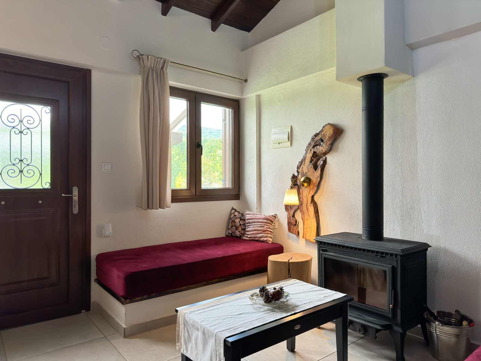 A two-level space with stairs leading to the upper bedroom, suitable to accommodate up to 4 adults. It features a double bed on the upper floor and a sofa bed in the living room area, as well as its own veranda with a view of the garden and the mountain.